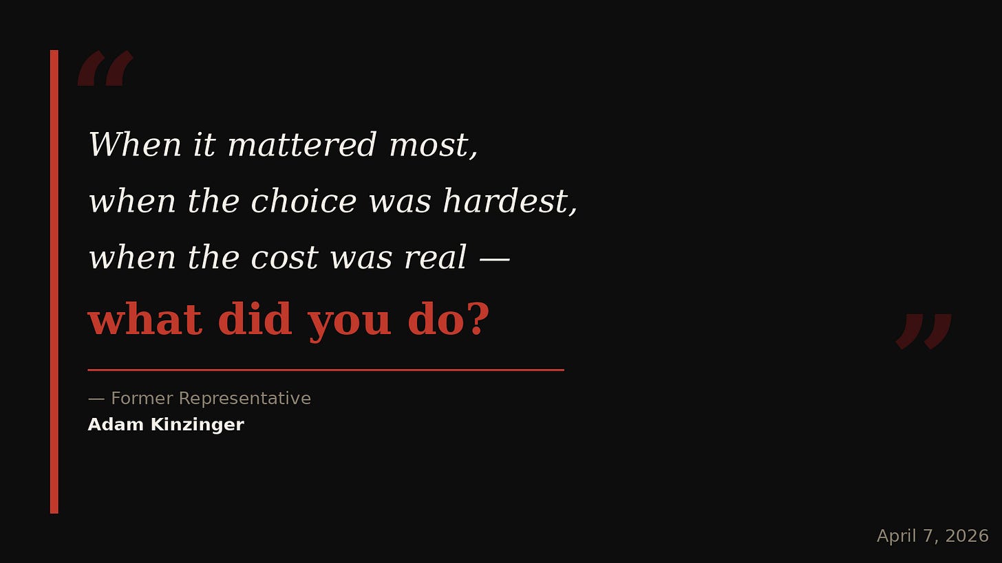 Not your political career. Your legacy. The thing your grandchildren will read about. The answer to the question every person in public life eventually has to answer: When it mattered most, when the choice was hardest, when the cost was real — what did you do?