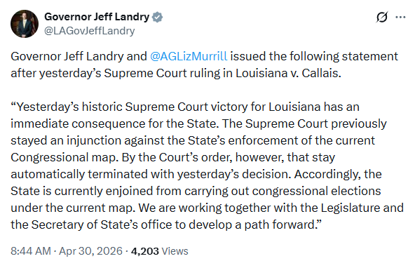 The move follows yesterday’s Supreme Court ruling striking down Louisiana’s congressional map as an unconstitutional racial gerrymander. Landry has been personally calling congressional Republicans to tell them the order is coming, possibly Friday, and Rep. Cleo Fields — the Black Democrat whose district sits at the center of the case — confirmed Landry told him directly. The plan: pause the election, let the GOP-supermajority legislature redraw the map before the June 1 session ends, then run primaries on whatever lines they produce.