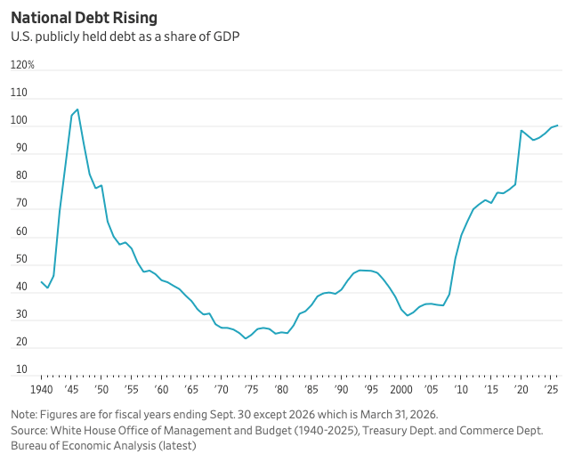 The Congressional Budget Office confirmed this year that U.S. debt held by the public has crossed 101 percent of GDP in 2026, with the deficit projected to hit $1.9 trillion this fiscal year alone. The last time debt reached this level was just after World War II, and that came with a war effort that rebuilt the global economy. The federal government now spends more on interest payments than it does on Medicare, national defense, Medicaid, and veterans benefits combined, with interest consuming nearly one-fifth of all federal revenue. The next crisis, whenever it comes, finds the U.S. Treasury with less room to respond than at any point in modern history. CBO projects debt reaching 120 percent of GDP by 2036, and the reconciliation bill currently moving through Congress is estimated to add another $2.4 trillion on top of that. At some point the math stops being a problem for future politicians and starts being a crisis for current Americans, and we are closer to that line than Washington is willing to admit. Chart via WSJ.