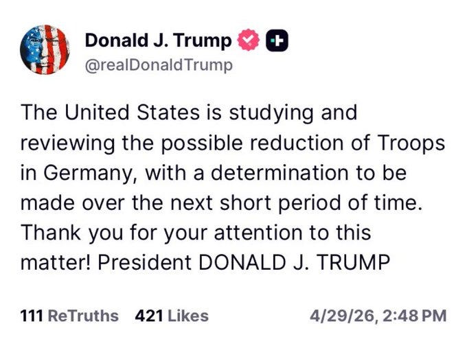 Hours after a 90-minute phone call with Vladimir Putin on Wednesday, President Trump posted on Truth Social that the U.S. is “studying and reviewing the possible reduction of Troops in Germany.”