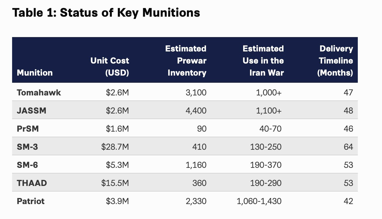 The numbers are stark. The U.S. has burned through roughly 1,100 long-range stealth cruise missiles built specifically for a war with China. That’s close to the total number remaining in the stockpile. More than 1,000 Tomahawk cruise missiles were used — about ten times the military’s annual purchase. Over 1,200 Patriot interceptor missiles were fired at more than $4 million each. To backfill the shortage, the Pentagon pulled Patriot missiles from the THAAD system in South Korea and moved the USS Abraham Lincoln from the South China Sea to the Middle East before the war even started. Chart via CSIS.