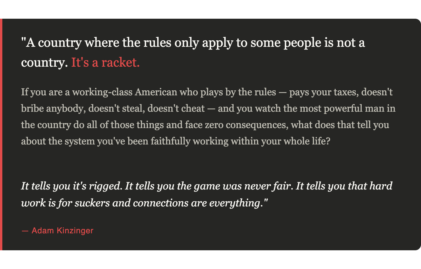 But here is the cold, hard truth about why all of this still has to happen: a country where the rules only apply to some people is not a country. It’s a racket. If you are a working-class American who plays by the rules — pays your taxes, doesn’t bribe anybody, doesn’t steal, doesn’t cheat — and you watch the most powerful man in the country do all of those things and face zero consequences, what does that tell you about the system you’ve been faithfully working within your whole life? It tells you it’s rigged. It tells you the game was never fair. It tells you that hard work is for suckers and connections are everything.