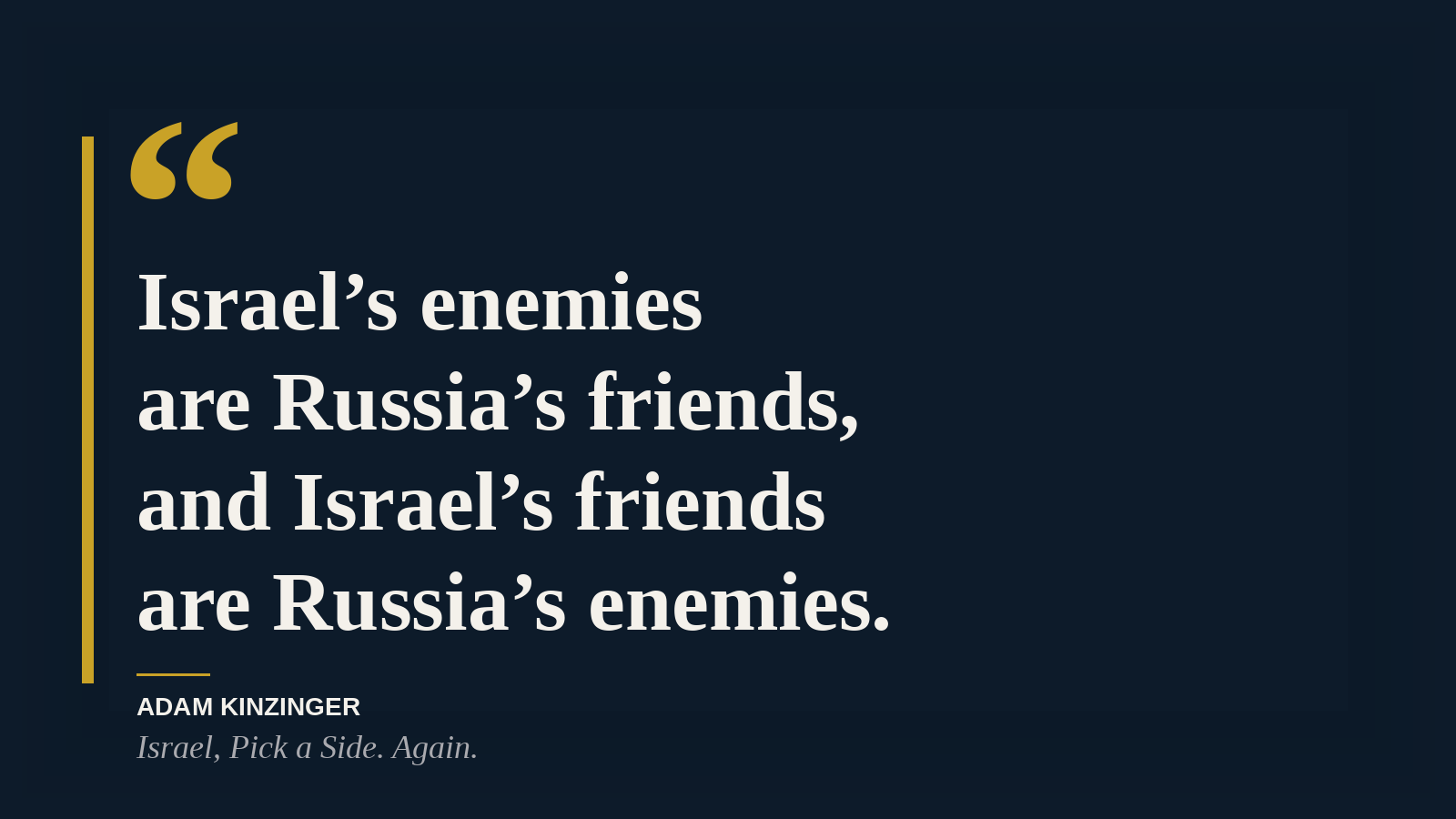 I said something close to this in March 2022, when I was still in Congress. I tweeted that Israel needed to pick a side, that “Israel doesn’t have a special exemption,” and that its posture on Ukraine would and should have a bearing on future U.S. aid. The pushback from American friends of Israel was immediate and loud. I was told repeatedly: you don’t understand, Israel is threatened, Israel can’t spare the materiel, Israel has to coordinate with Russia in Syria, you don’t get it.