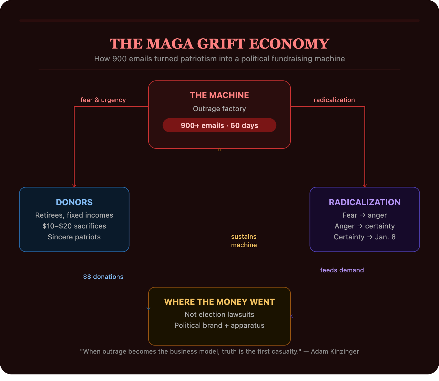 In the weeks between Election Day 2020 and January 6, the Republican base was being hit with a flood of fundraising emails unlike anything I’d ever seen in politics. Not one or two a day. Eight, ten — sometimes more — landing in inboxes every single day. When investigators tallied the full volume of what went out during that two-month window, the number was staggering.