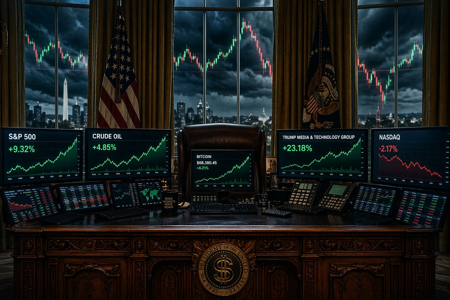 One week later, on April 9, with portfolios still bleeding out, Trump posted the words “THIS IS A GREAT TIME TO BUY!!” on Truth Social and signed it “DJT” — which, by a happy coincidence, is also the ticker symbol for his own company. A few hours after that post, he announced a 90-day pause on most of the tariffs. The S&P 500 rocketed more than 9% in an afternoon, one of the largest single-day gains on record. Trump Media closed up nearly 23%. The President’s personal stake in Trump Media, now held in a trust controlled by his oldest son, gained something on the order of $415 million on a single day.
