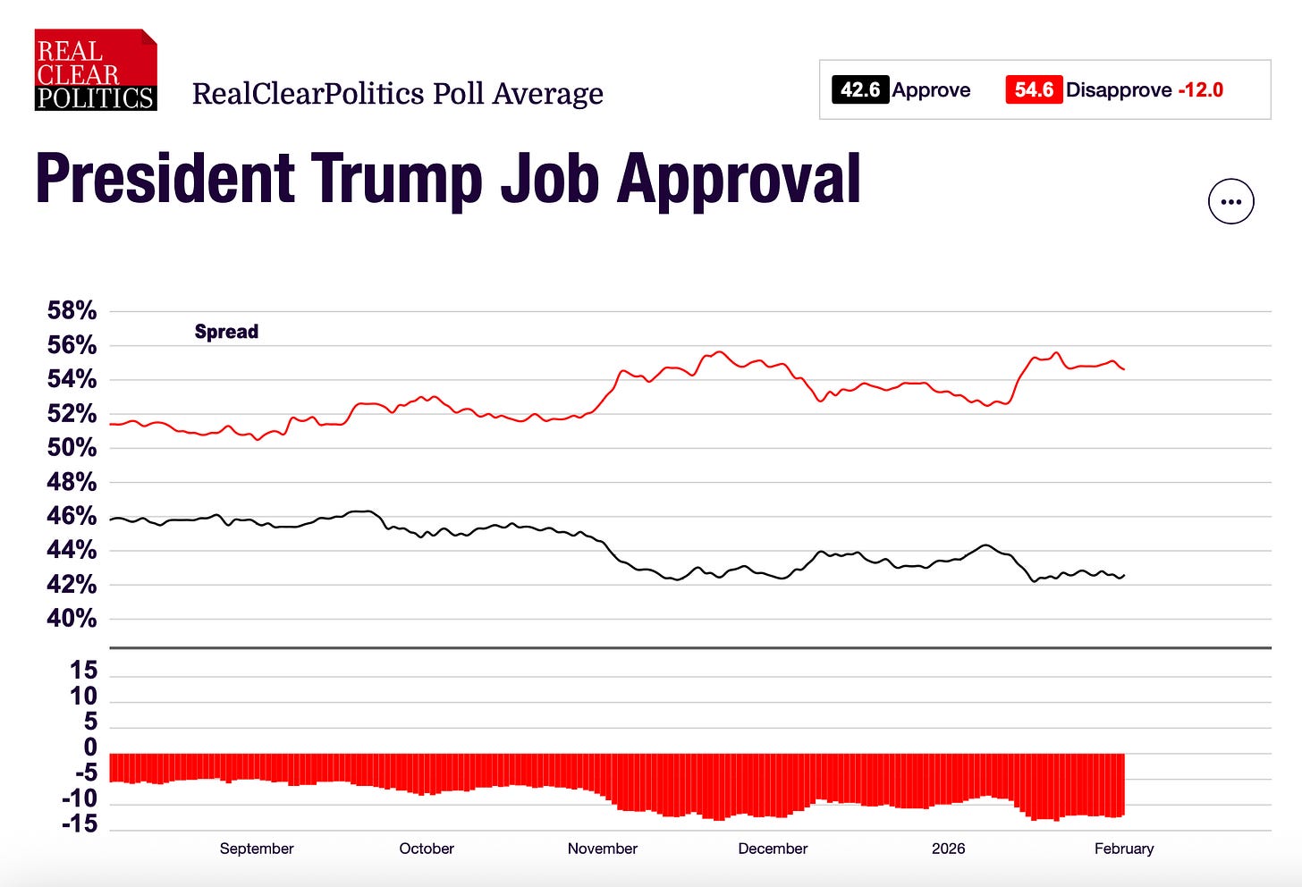 That advantage is reinforced by President Donald Trump’s job approval sitting clearly underwater in major trackers. RealClearPolling shows an average around 42.6% approve / 55.1% disapprove (net -12.5) in the most recent window it reports. Decision Desk HQ’s average is similar (42.9 approve / 54.5 disapprove). As you can see by the chart below courtesy of RealClearPolitics, President Trump’s approvals have trended steadily downward for the last six months, reaching new lows in recent weeks in part due to the furor over ICE’s actions in Minnesota.